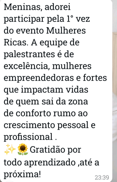 Você terá acesso a palestras e workshops com mentoras renomadas, networking com outras mulheres empreendedoras, insights que podem transformar sua carreira, além de estratégias práticas para aumentar sua presença no digital, melhorar sua autoestima, usar sua voz a seu favor e cuidar do seu bem-estar.